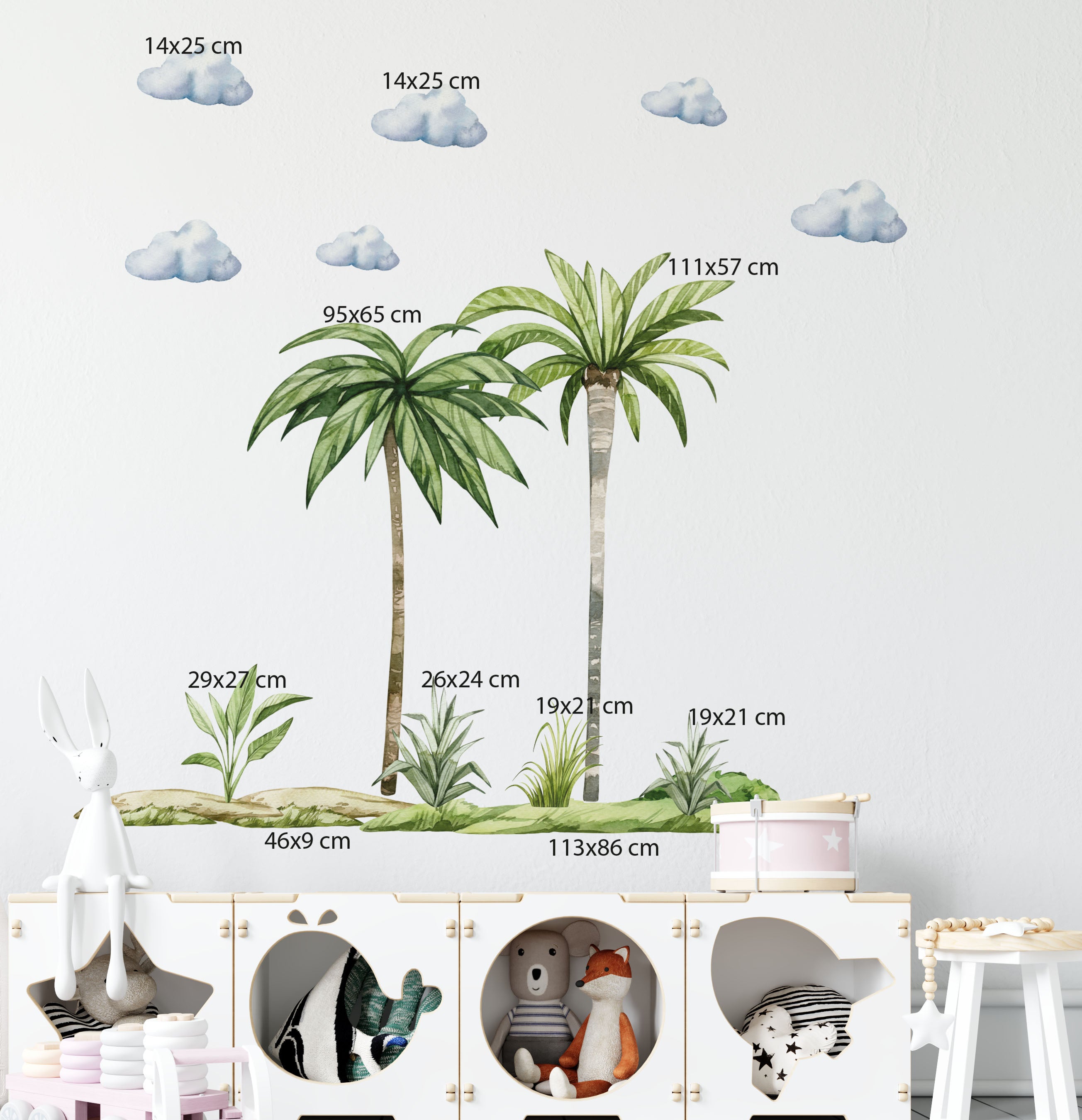 Palm tree decal that will fit to every walldecal collection: safari and jungle as well as dinosaurs. IgiBee wall decals, you can transform any room into a Jurassic or jungle room whether it be your kid's room, nursery room, or simply your playroom. This palm trees wall decal set includes two palms with grass.