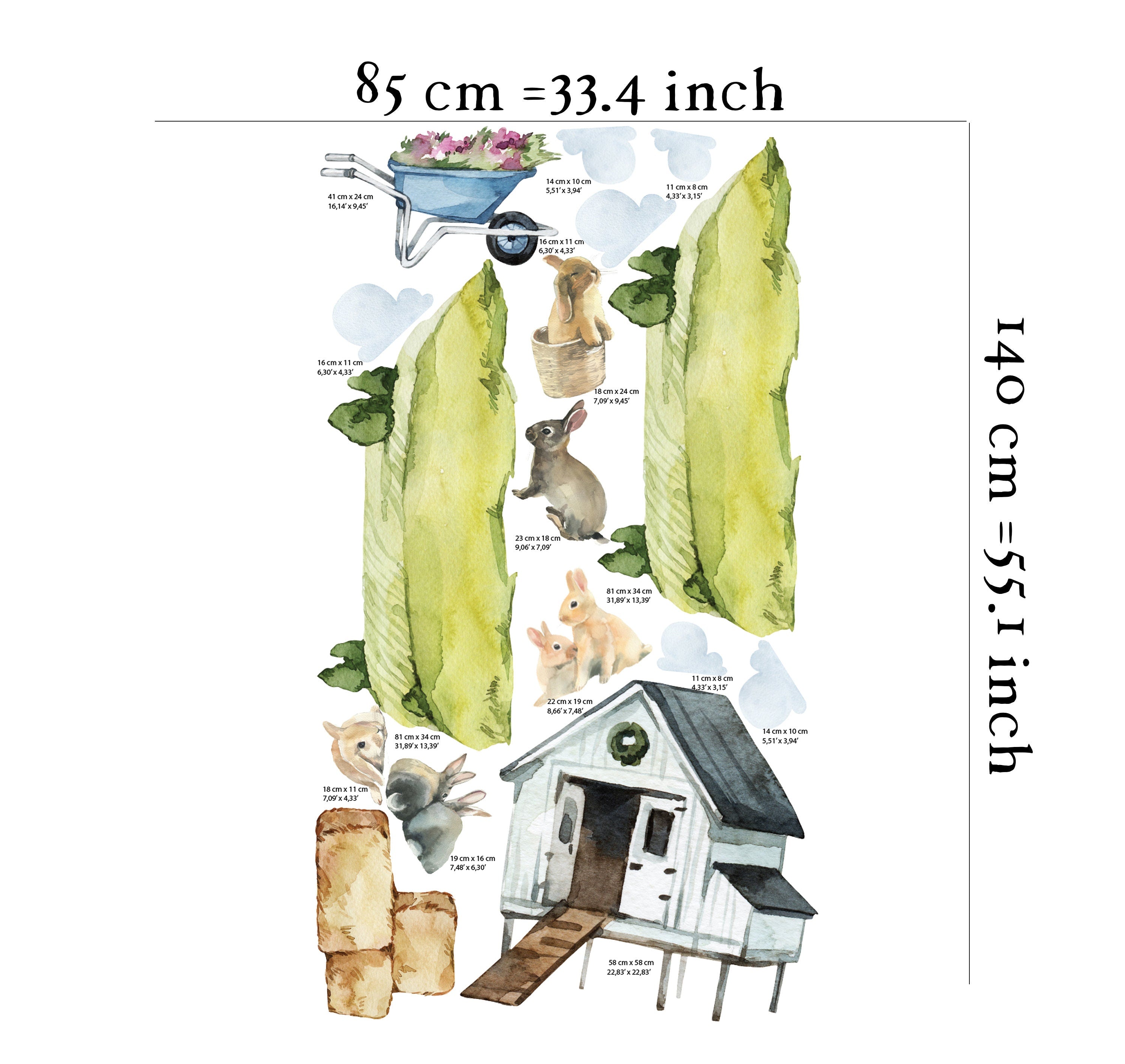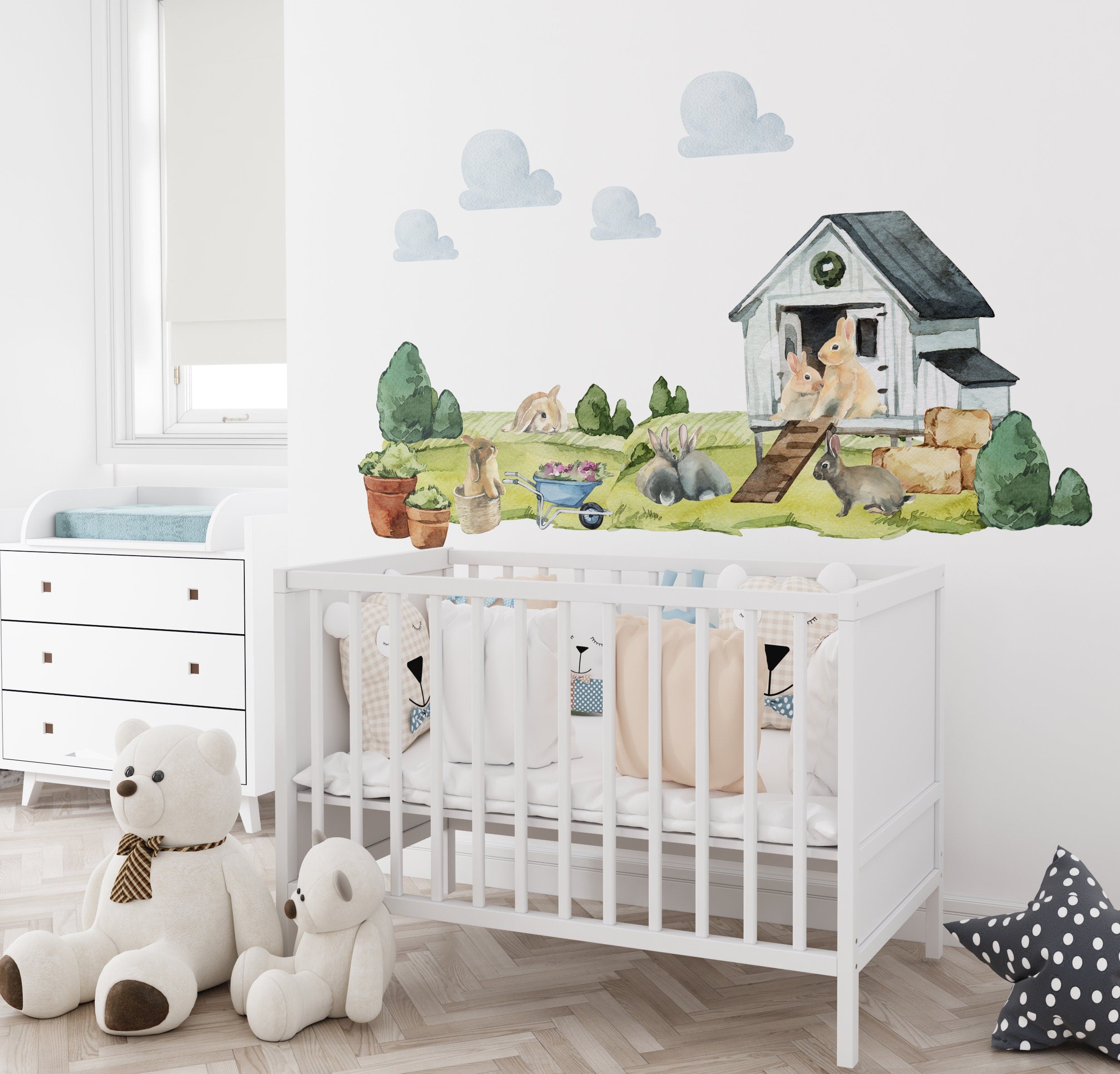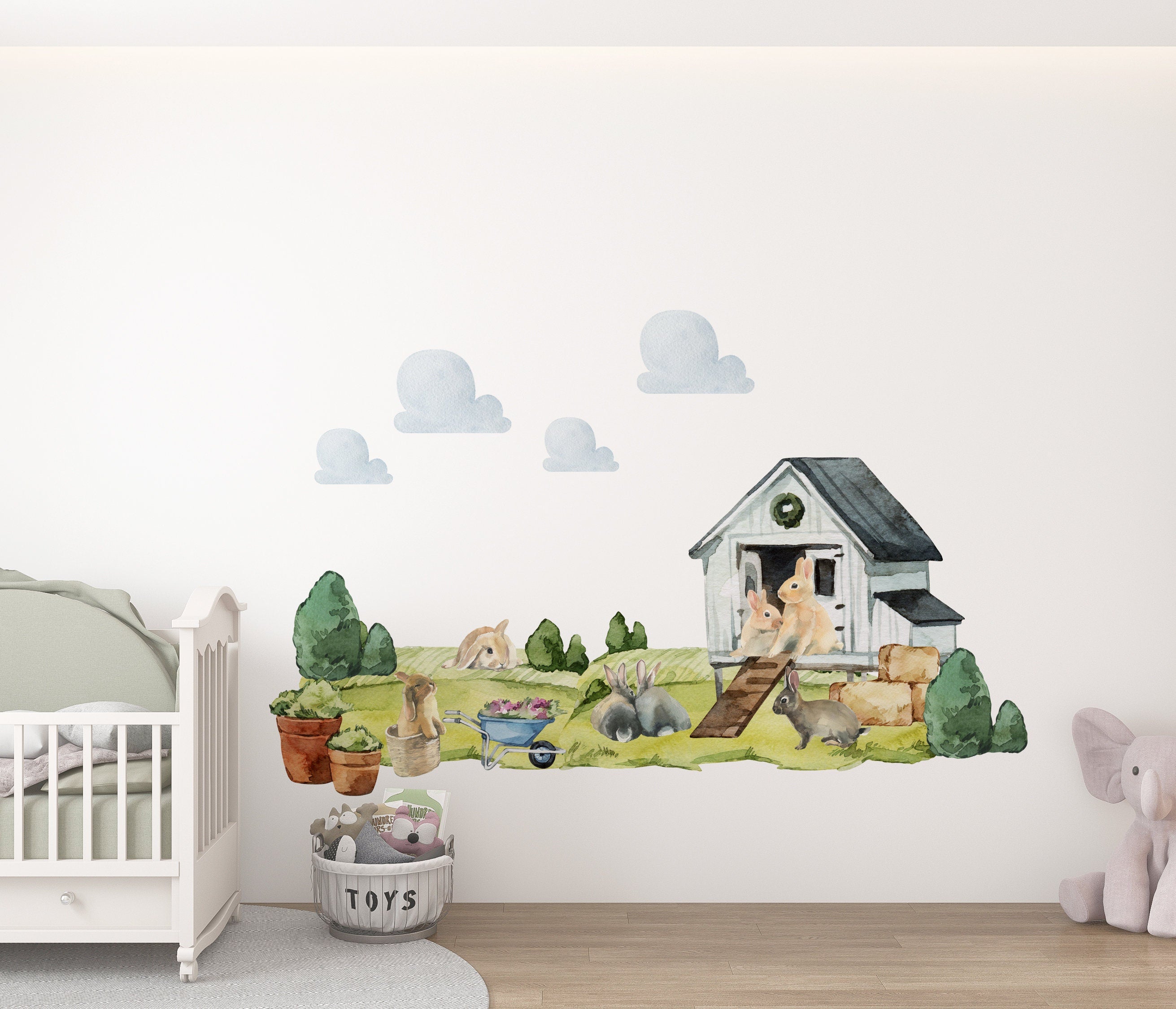farm nursery decor for your room. Enhance your nursery with our enchanting farm nursery wall decals - a delightful blend of adorable rabbits, blooming flowers, and a charming barn. This amazing nursery wall decor adds a touch of rural magic to your little one's space. With easy application, you can quickly transform the room into a captivating farm scene, stimulating your child's imagination and creating a joyful atmosphere. Let your baby explore the wonders of the countryside from the comfort of their nursery with these delightful decals.