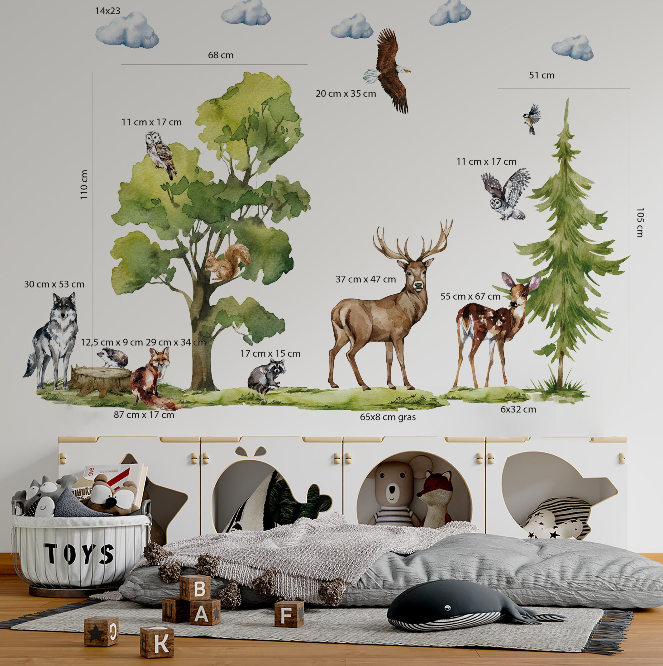 Forest wall decal big set, Woodland wall decal in your kids room, Peel and stick woodland animal vinyl decal YOU'LL LOVE TO HANG ON YOUR WALLS: With IgiBee wall decals, you can transform any room into a forest with our forest animal wall decal- whether it be your kid's room, nursery room, or simply your playroom. This woodland wall decal set includes some of the most recognized forest animals, deer, eagle, owl, wolf, Hedgehog, birds, racoon, trees hand-painted watercolours for the children's room. This Sticker Set, deer wall decal, woolf decal , Peel and stick is really easy to apply. Amazing woodland wall decal will look great in the children's room. The forest decoration set is an amazing gift idea. The product is delivered on a sheet and shipped in a cardboard tube. The dimensions are in the product pictures to get a better impression of it.