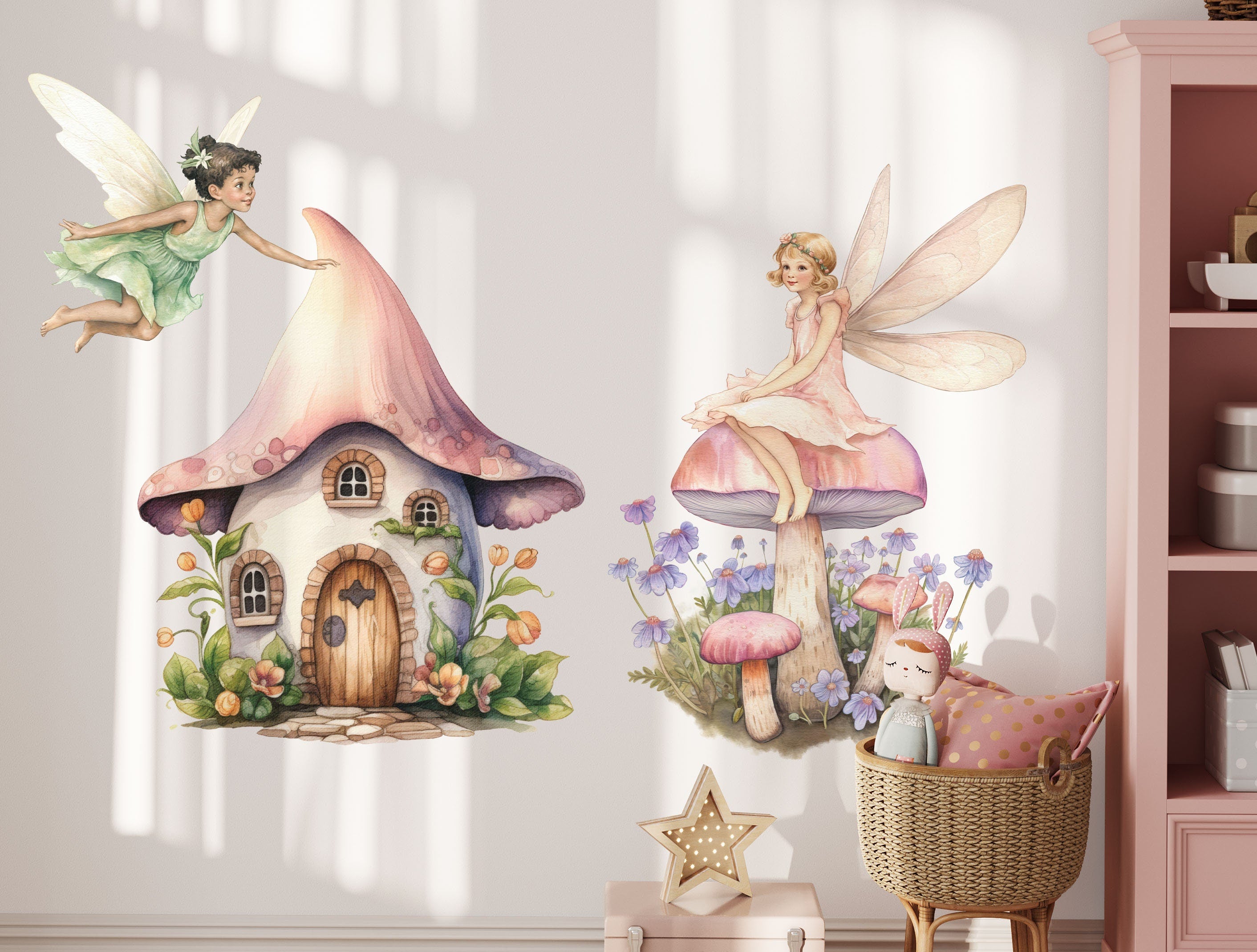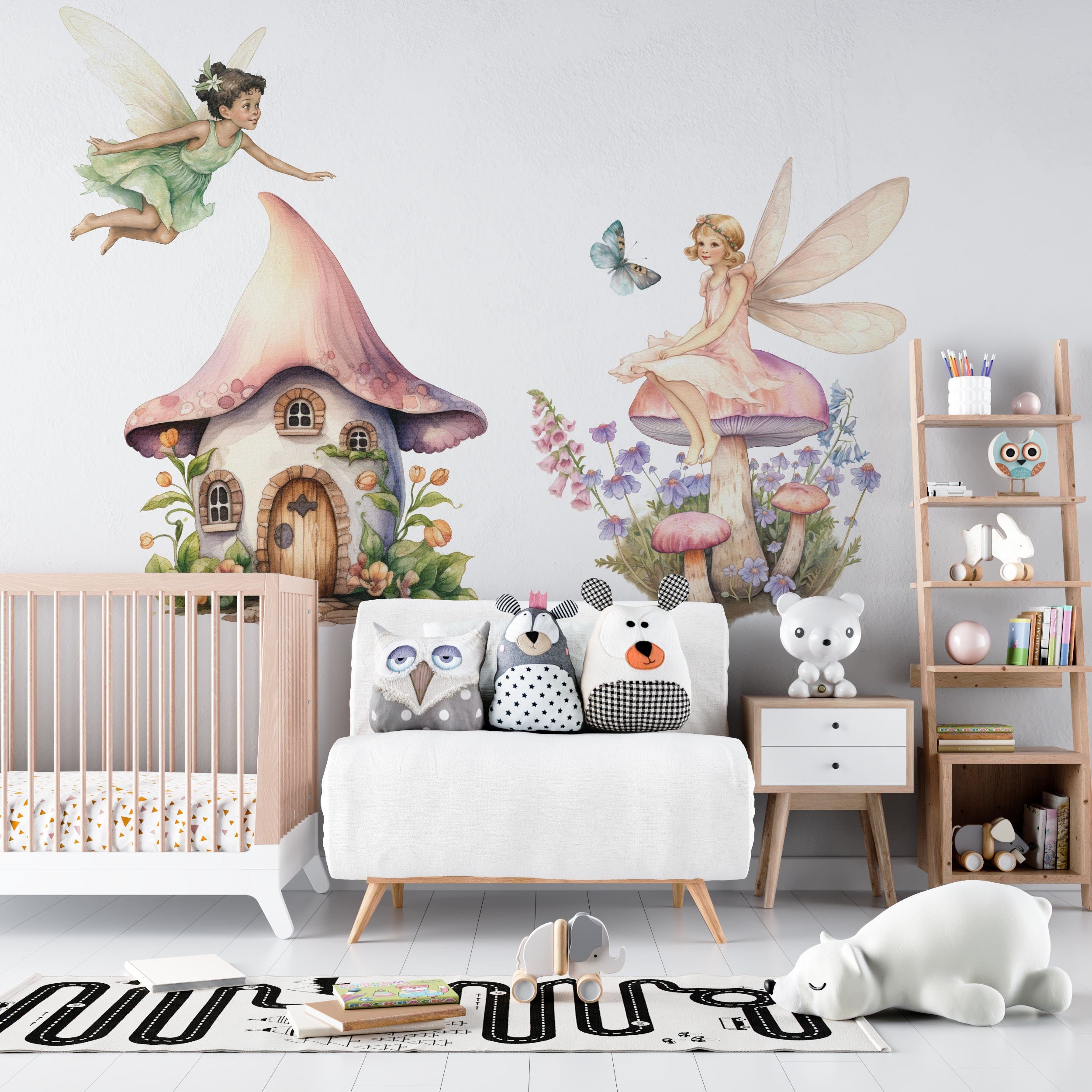 Fairy Wall Decals – the ultimate kids' decor solution. These delightful peel-and-stick stickers feature adorable fairies in charming dresses, nestled alongside their whimsical homes. Our extensive collection boasts a variety of captivating designs to suit every little princess's taste. Explore our store for more enchanting options and be sure to review all images for inspiration.