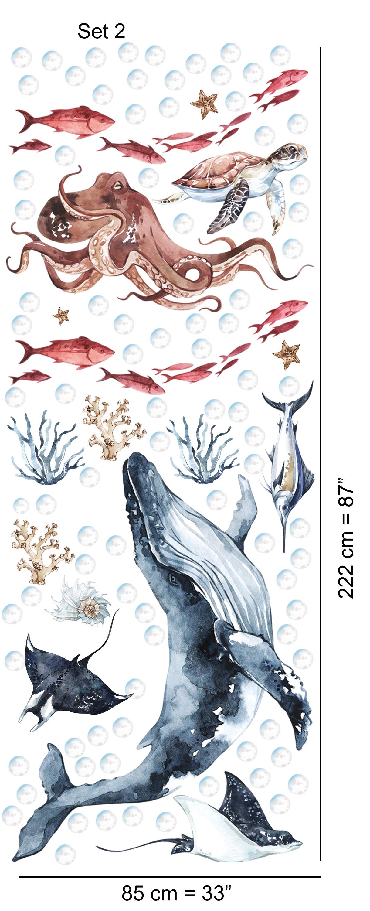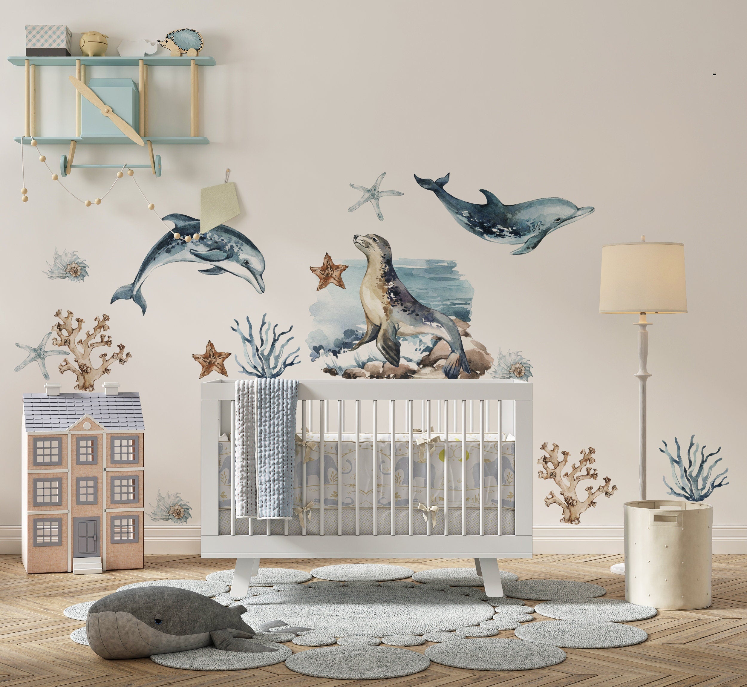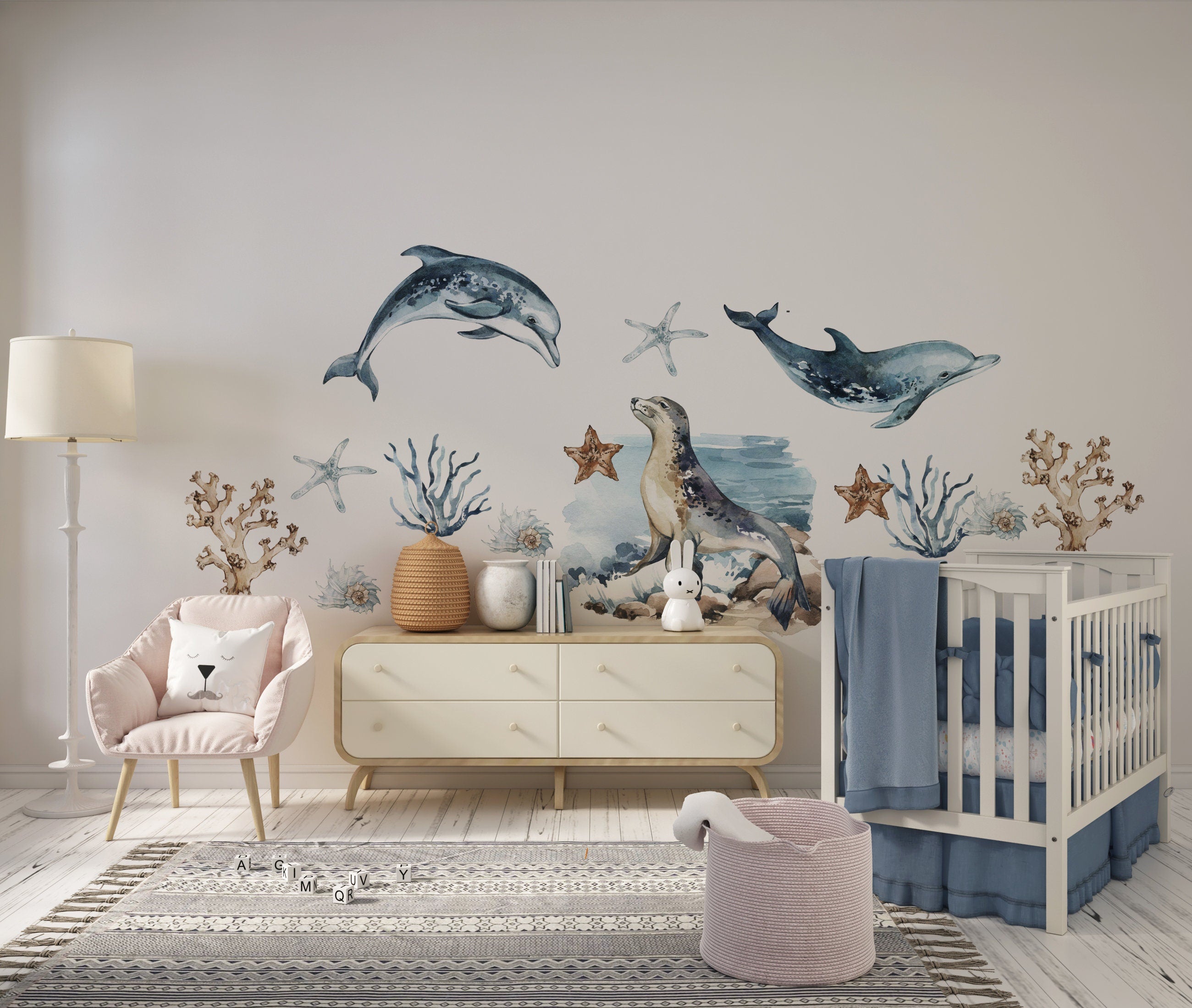 Create a splash in your child’s room with our Ocean Mammals wall decal set! This captivating collection features playful dolphins leaping through waves, a majestic whale gliding in the deep, and an adorable seal basking in the sun. Paired with ocean-inspired elements like waves, bubbles, and seaweed, this set transforms any space into a vibrant underwater adventure.