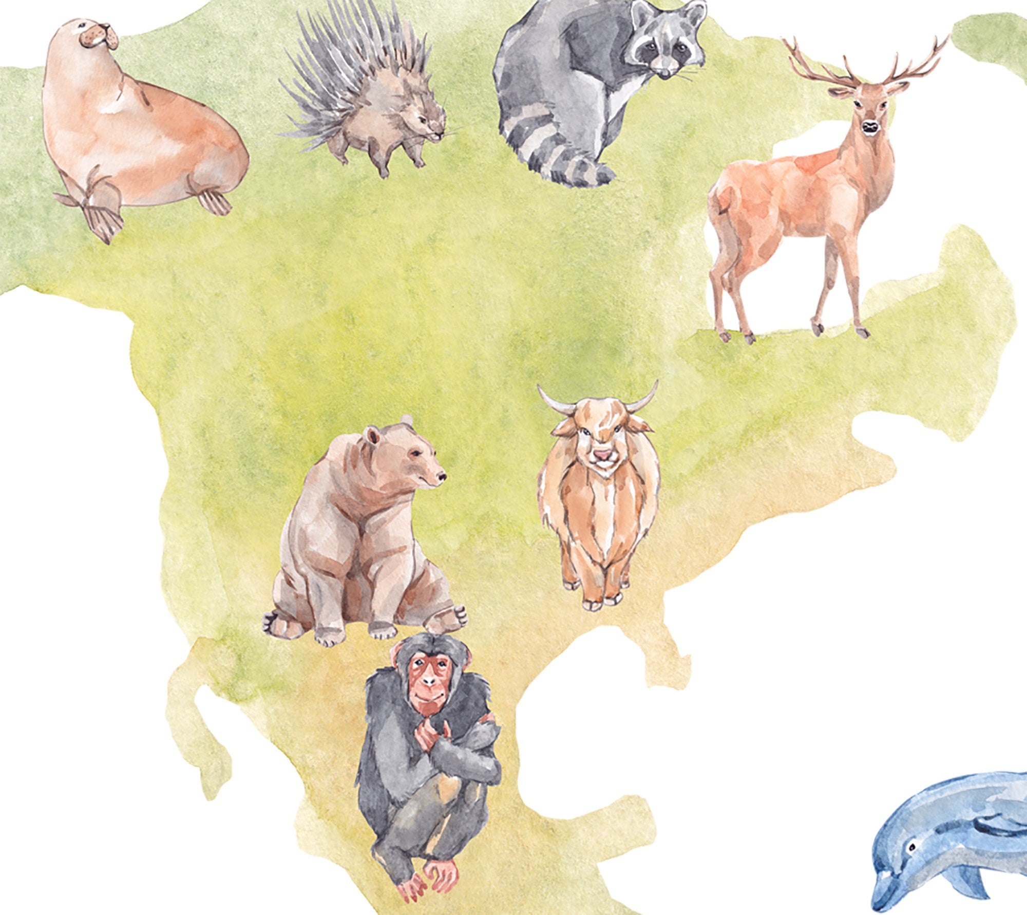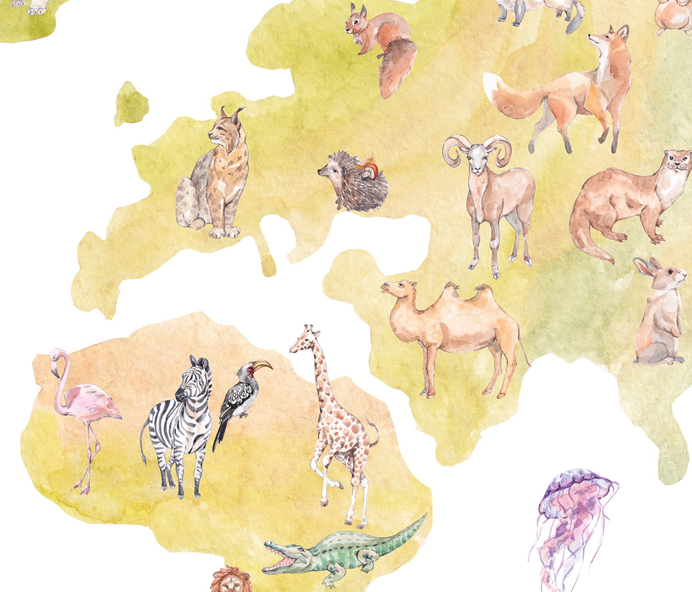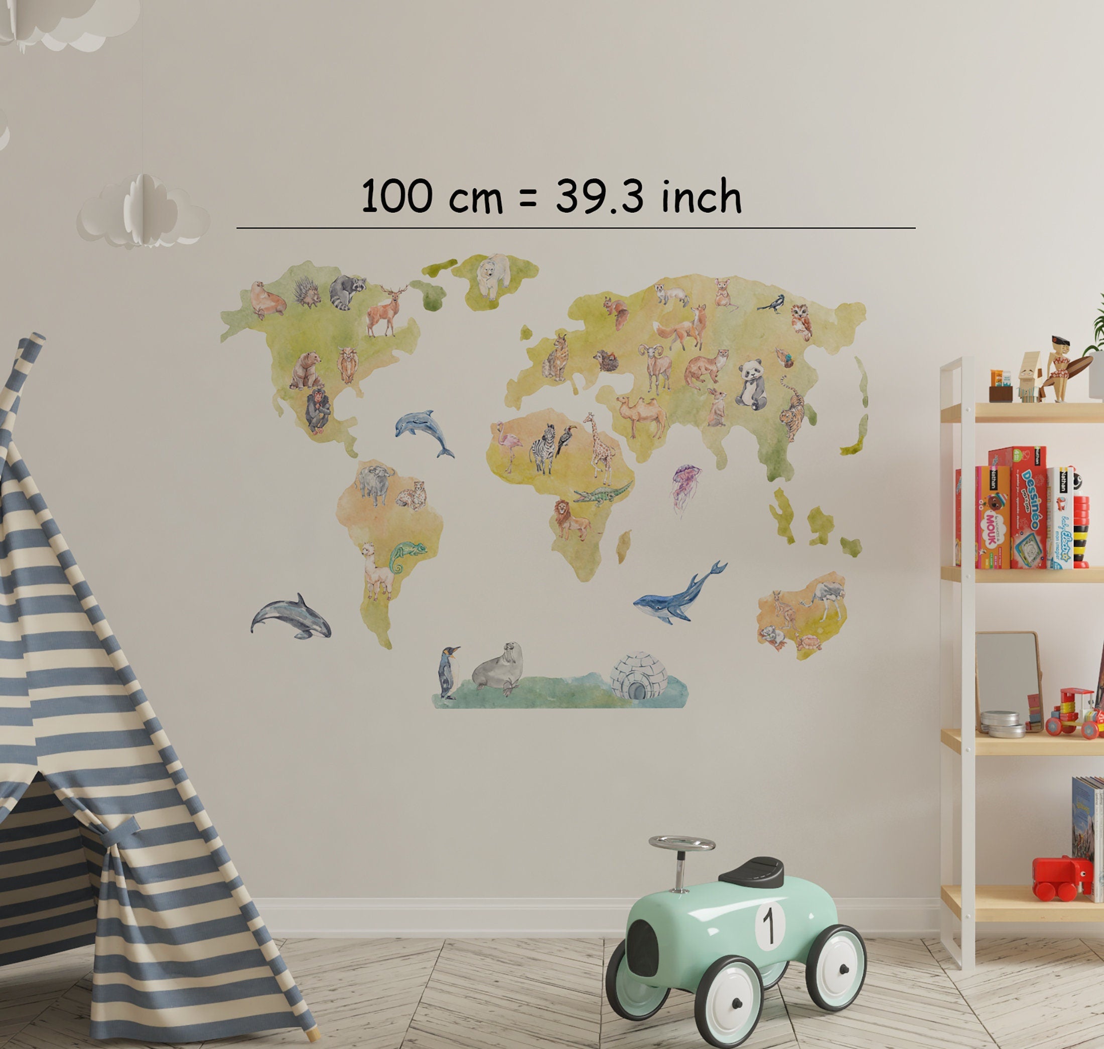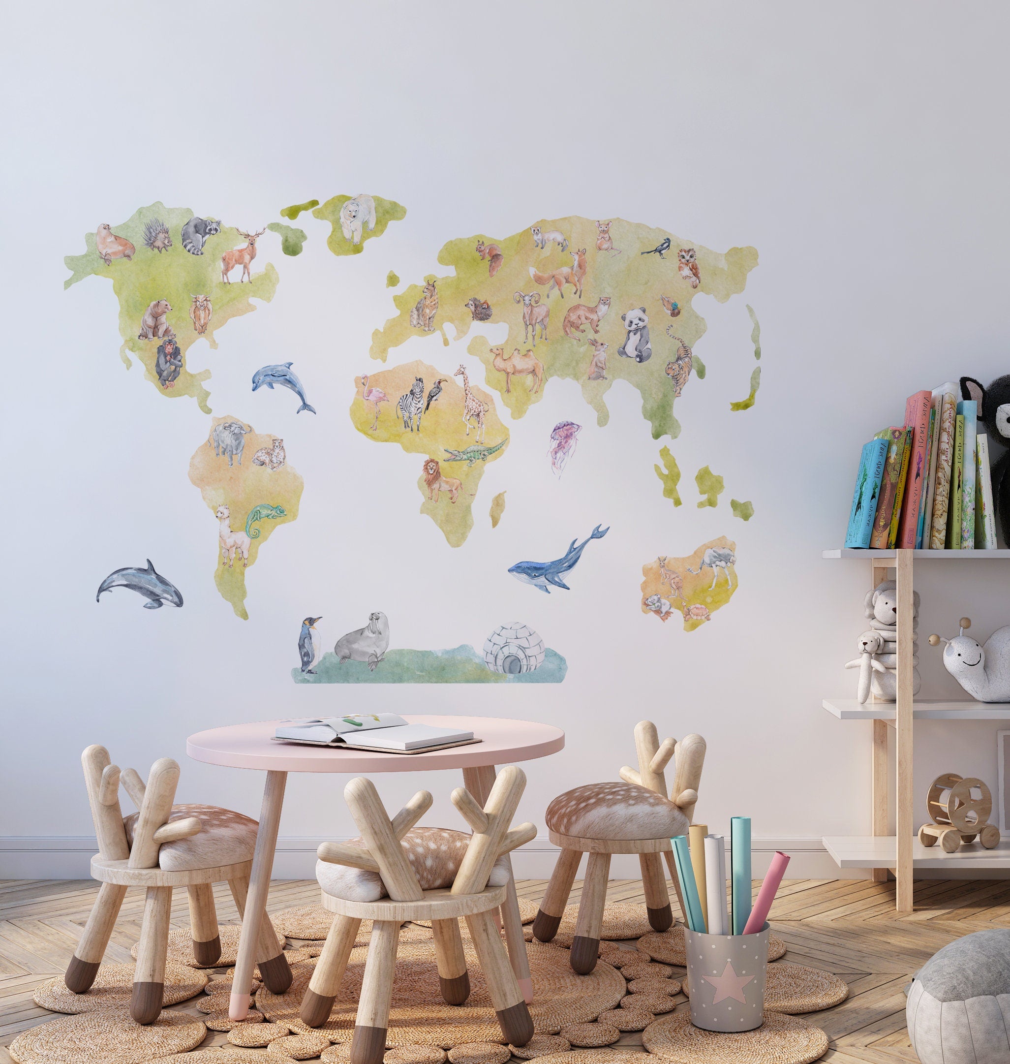 World map wall decal with animals – watercolor continents for kids’ room and nursery